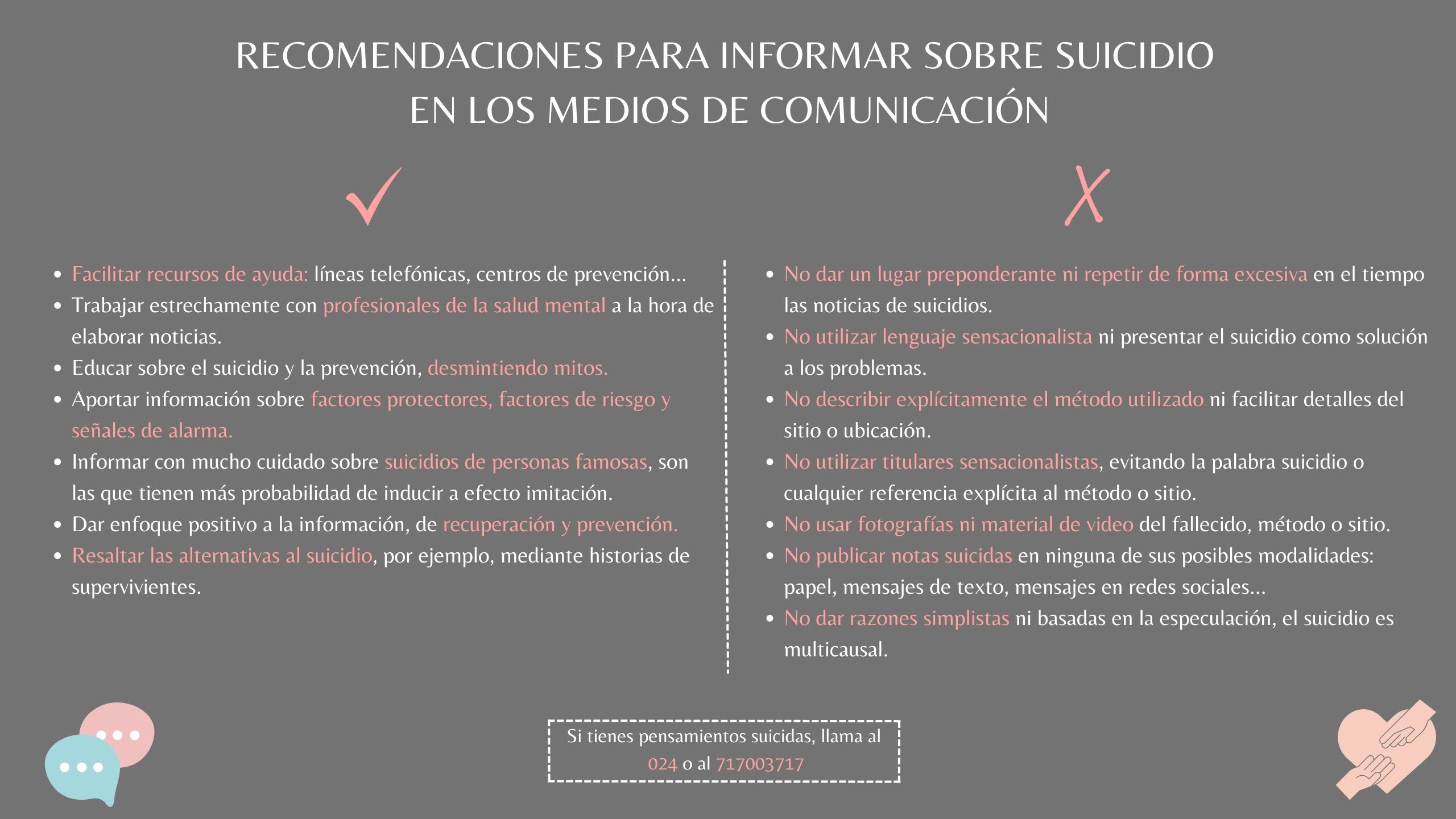 Según la OMS, refiriéndose al suicidio, “el silencio informativo no es la opción ante la situación de este grave problema de salud pública”. No hablar sobre la problemática del suicidio en los medios de comunicación no ha hecho que disminuyan los casos, solo ha retrasado el inicio de un ciclo en el que estos comiencen a actuar, coordinados con expertos en salud mental y en prevención, para contribuir, de verdad, a la disminución de fallecidos por esta causa.